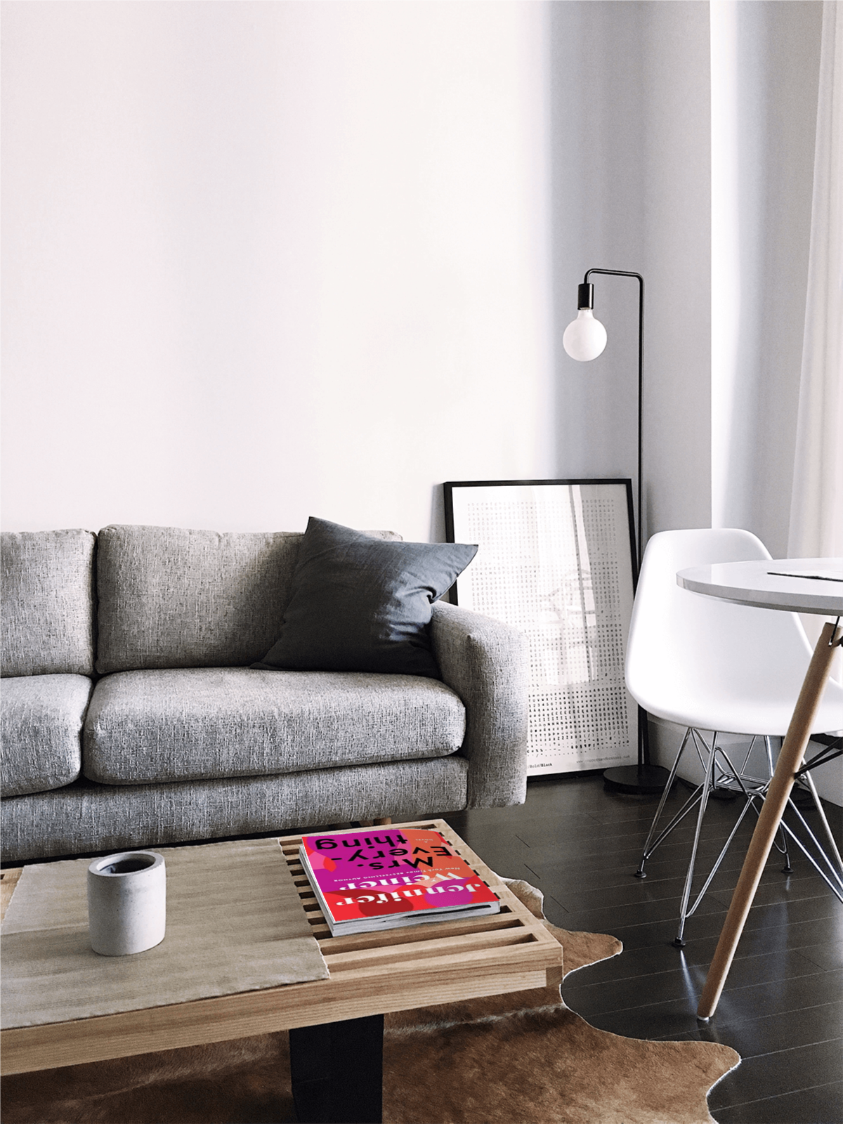 Book on table in grey living room