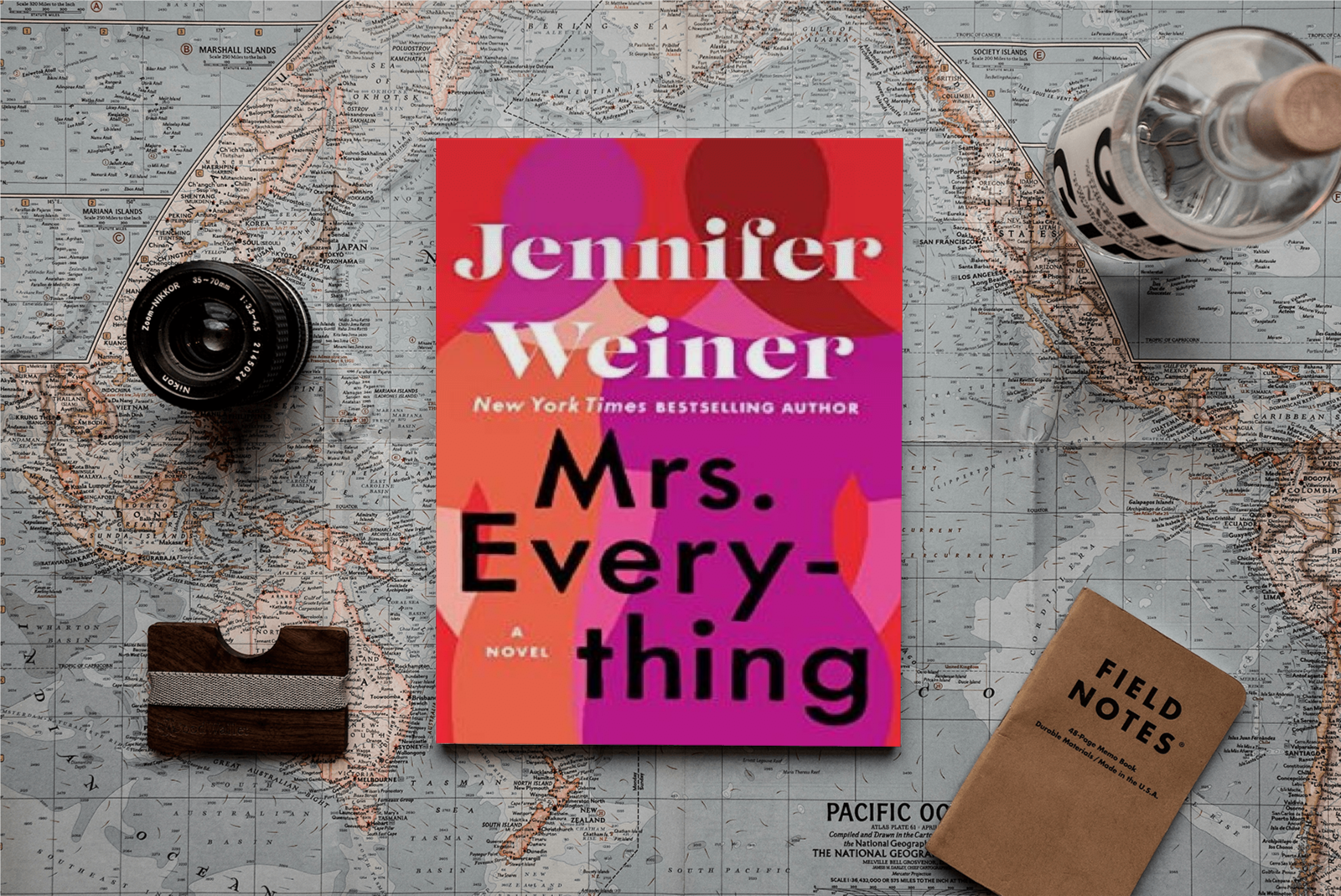 Feature book, keyboard, pens, sticky notes, phone, photographs, carnations, and pictures