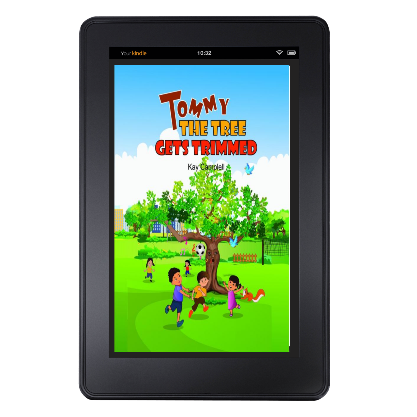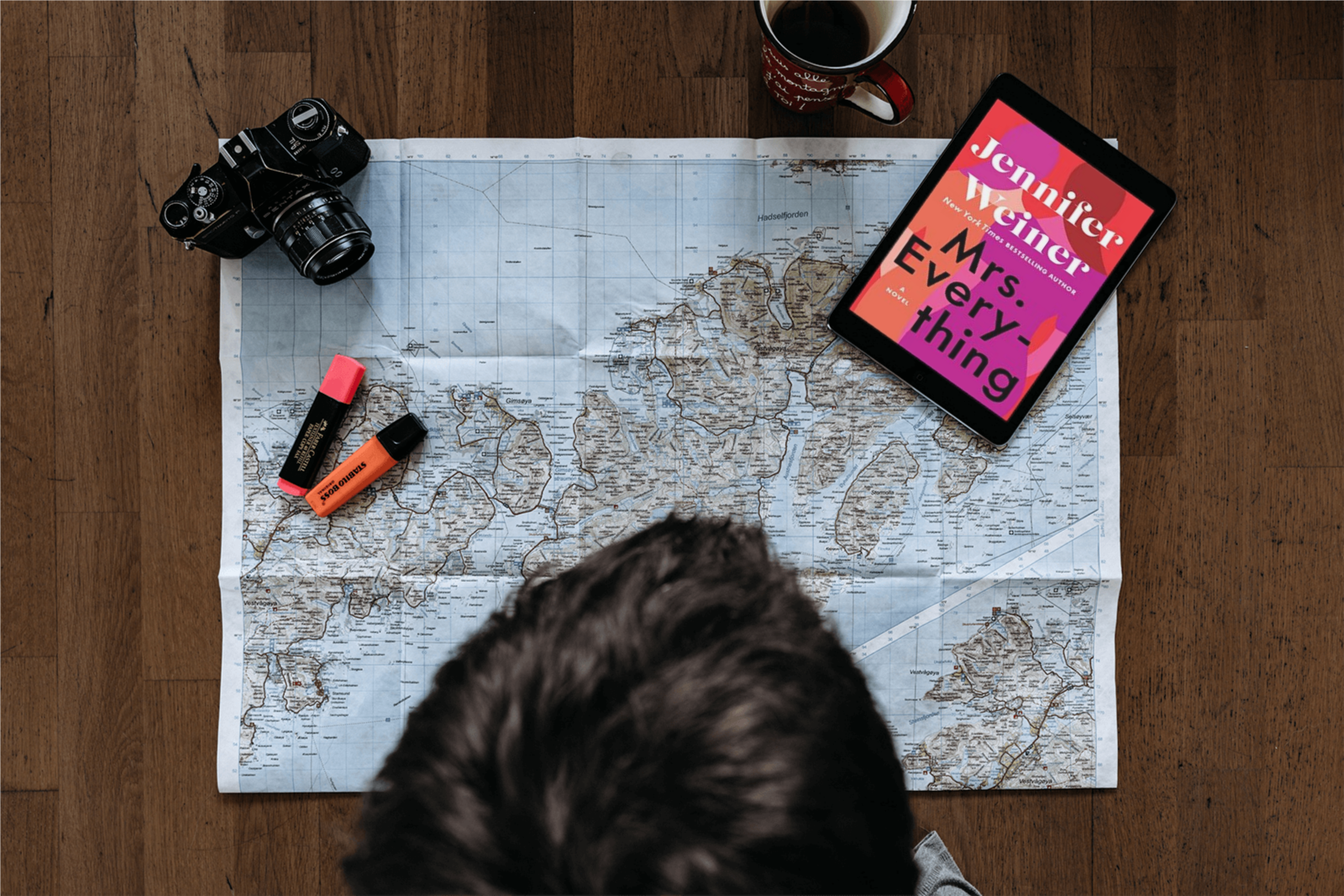 E-book on tablet on business desk with phone, newspaper, calculator, notepad, coffee, and paperwork.