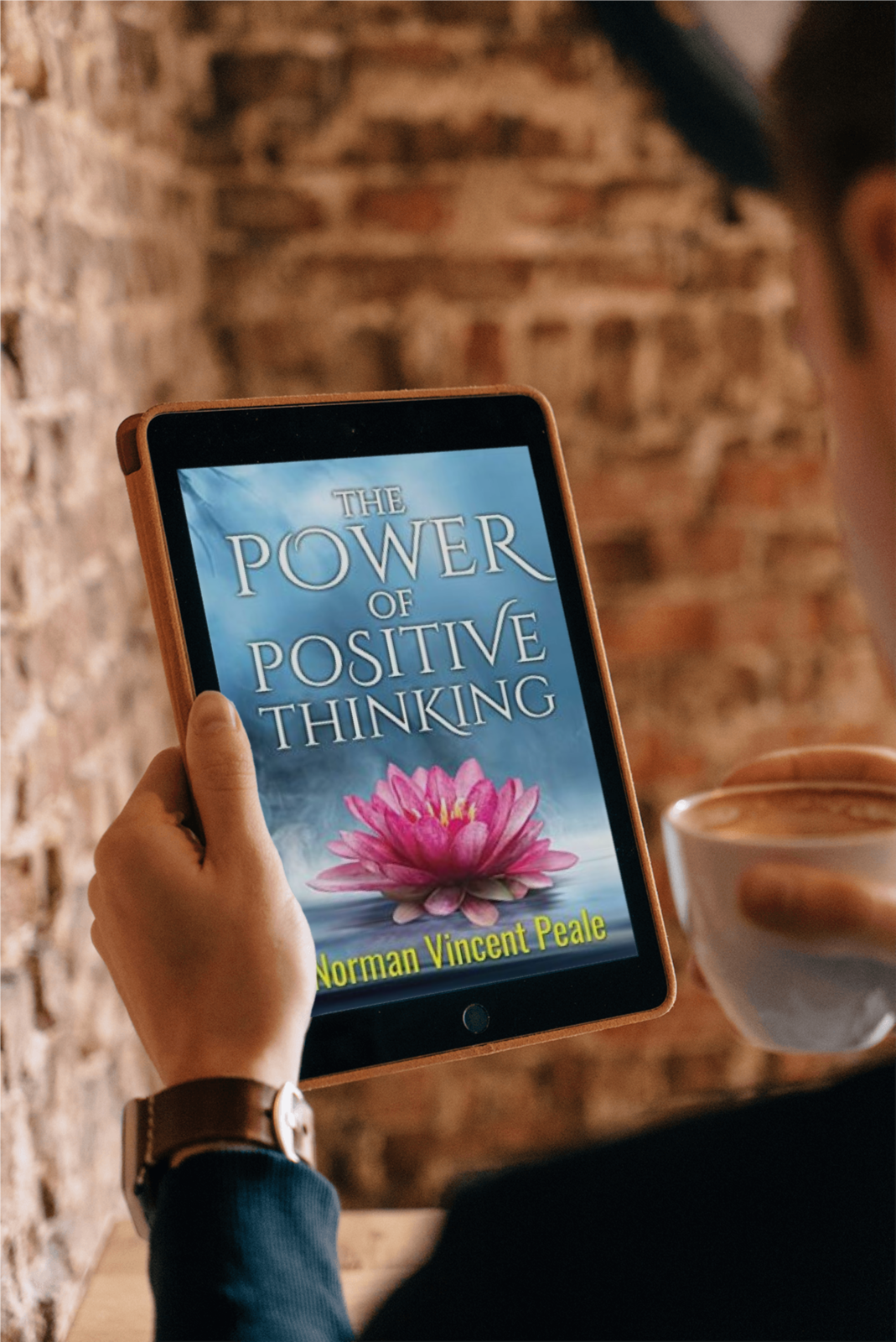 Male holding an e-book on small tablet in front of red brick wall while drinking a hot drink
