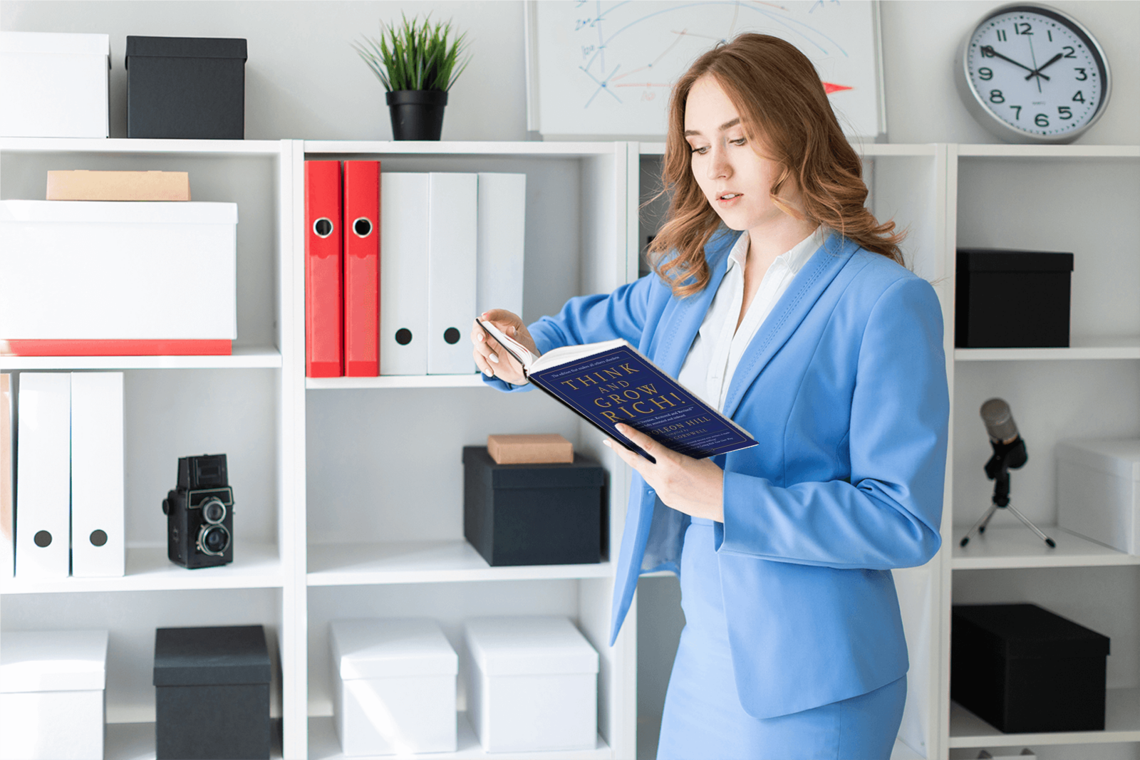 Woman reading book standing in front of bookshelf