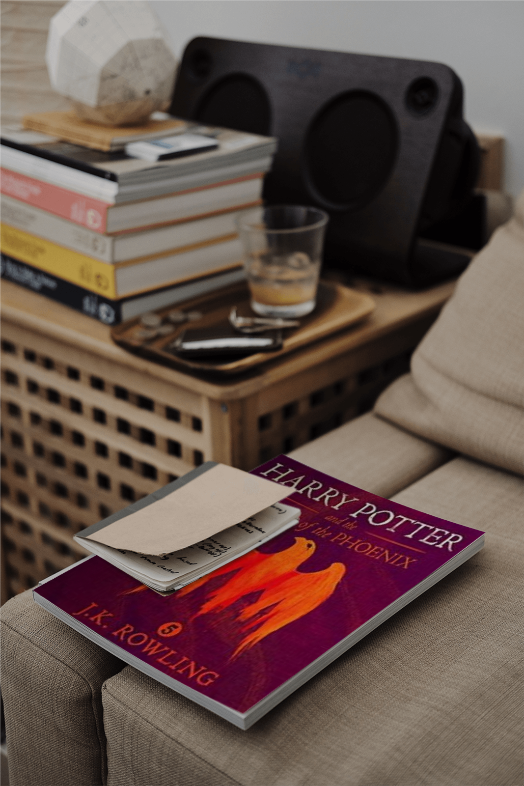 Feauture book with another book sitting on couch.  Arm table next to couch with stack of books