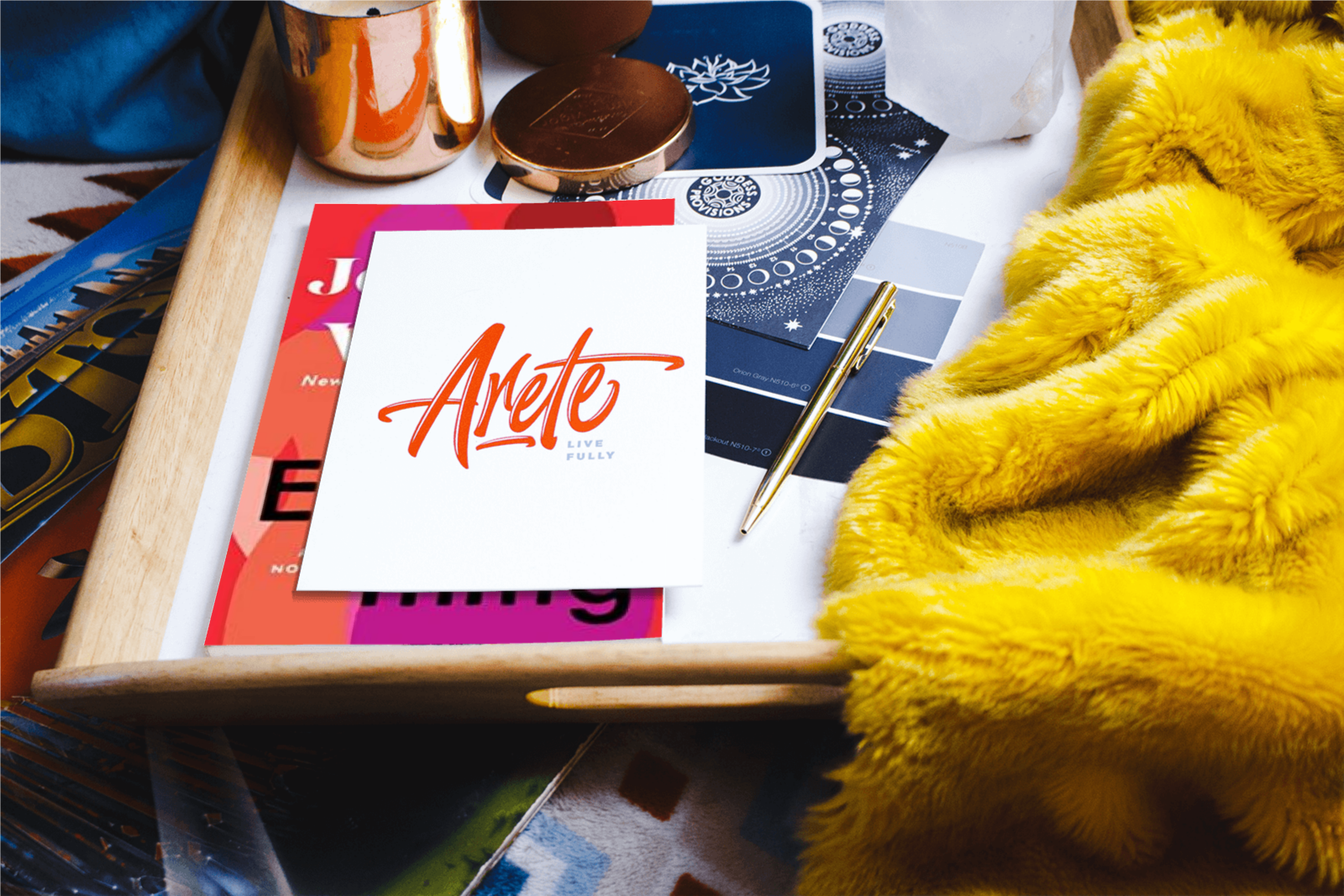 Mock 228 All Hardback Paperback Mockup 228Mockup 228Book with card on top, pen, yellow fuzzy robe, blue design on bottom