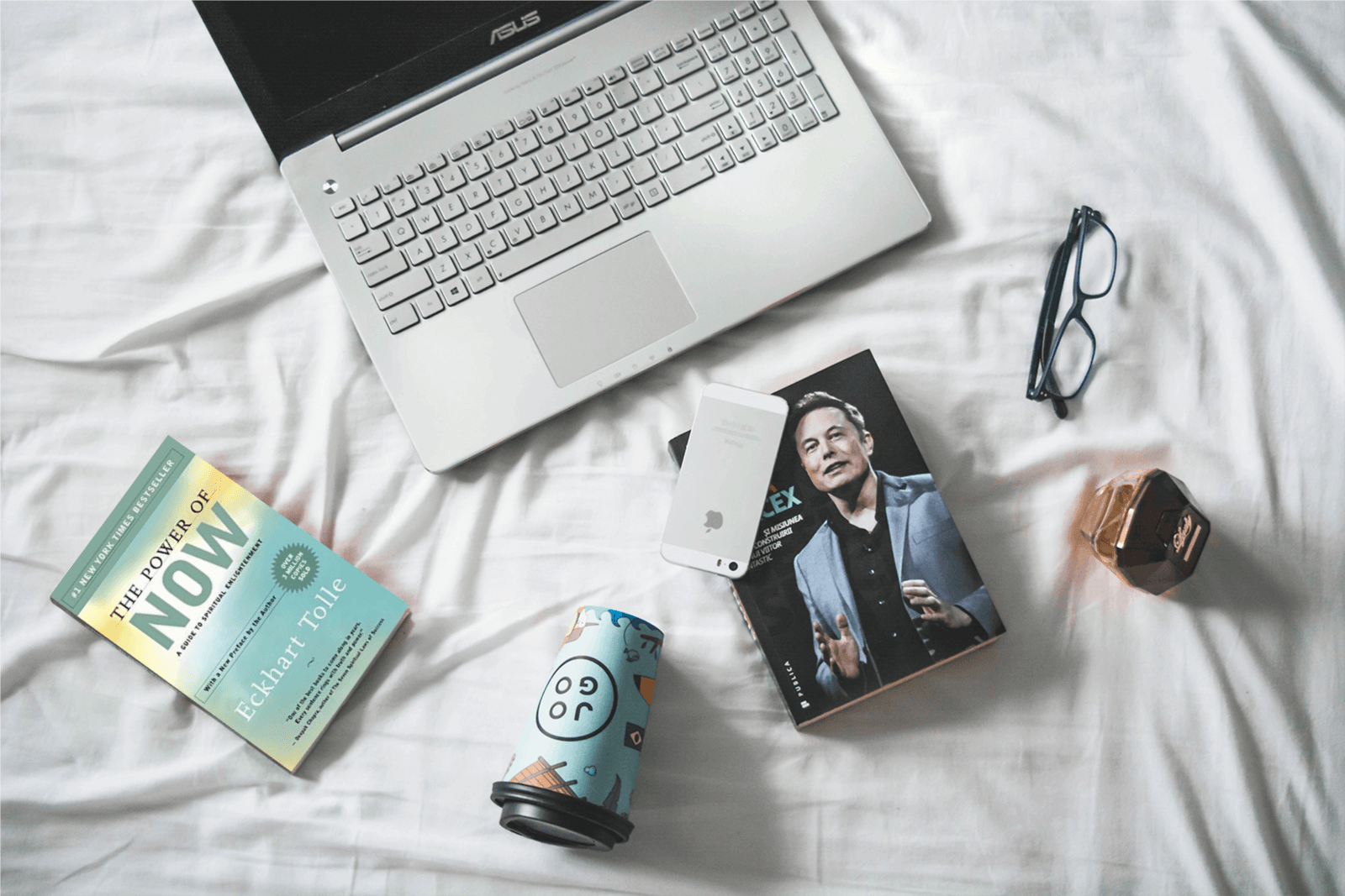 Mock 269 All Hardback Paperback Mockup 269Mockup 269Silver laptop, paper coffee cups, book with man, white phone, reading glasses on sheet
