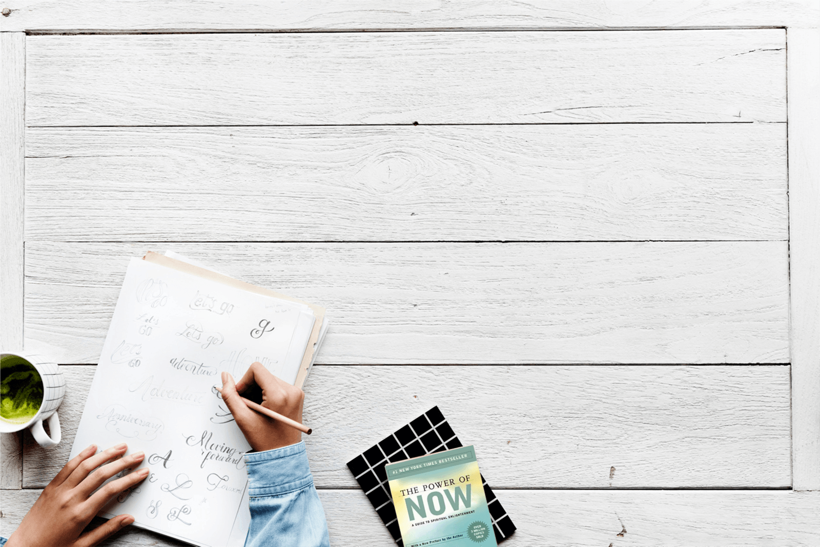 Mock 271 All Hardback Paperback Mock 271Mockup 271Book on black and white notebook, person scribbling, hot drink. White wooden background