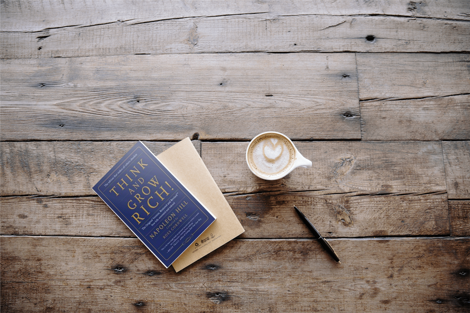 Feature book with other book, pen, and cup