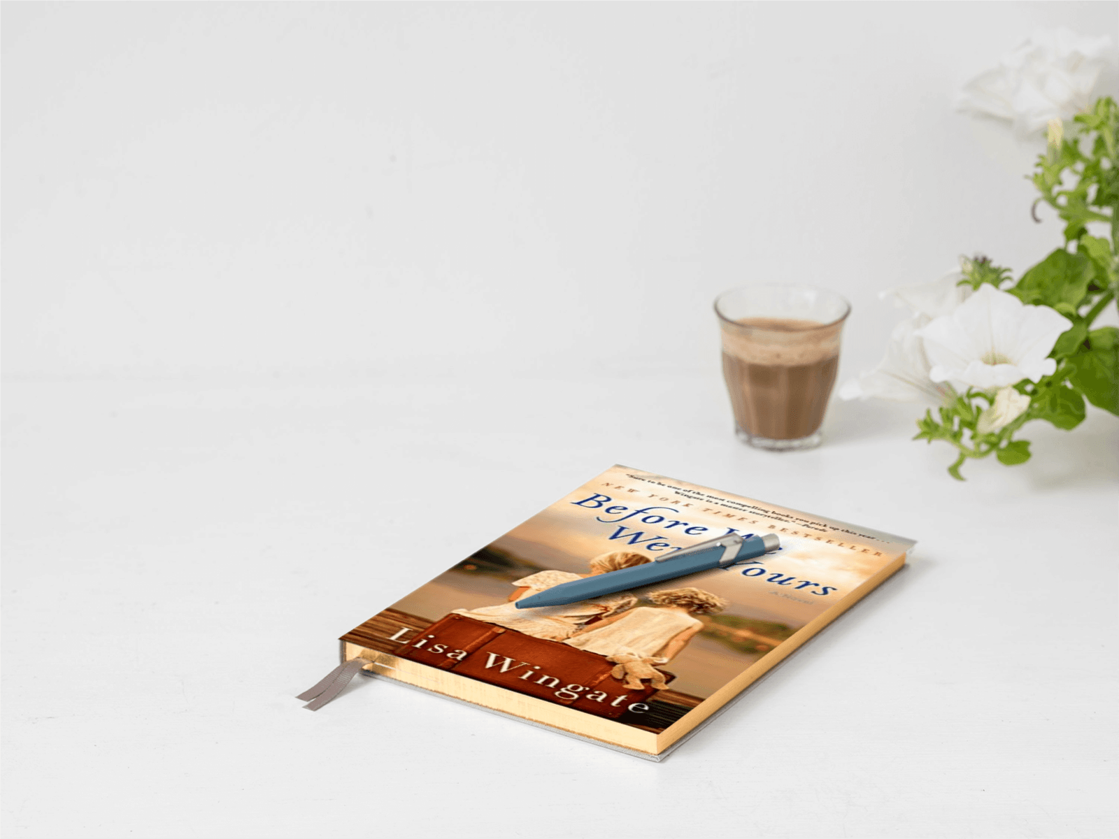 Mock 349 All Hardback Paperback Mock 349Mockup 349Book on light blue background with light blue pen on it. Hot chocolate and white petunia