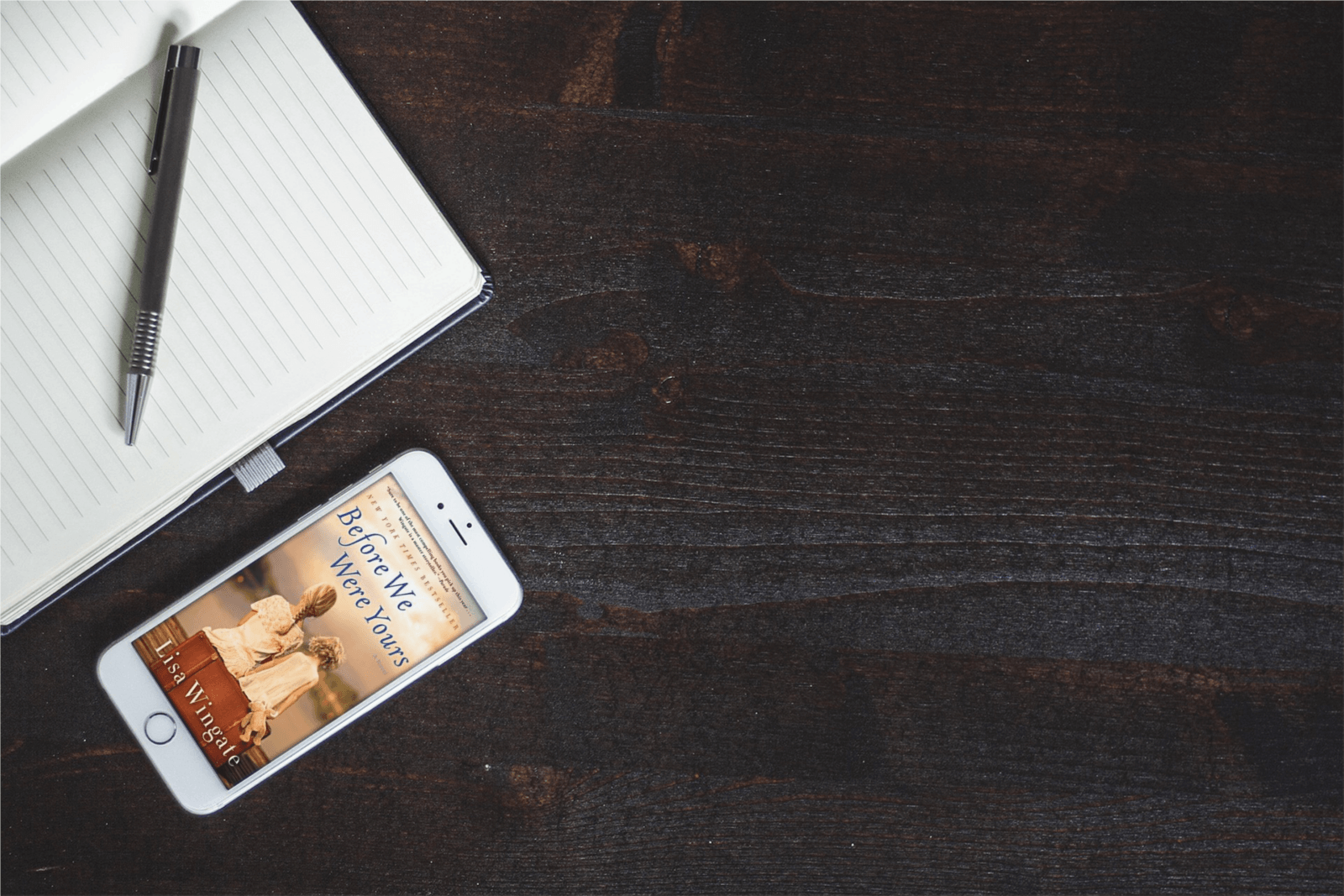 E-book on white phone by notepad and pen.  Background dark wood table