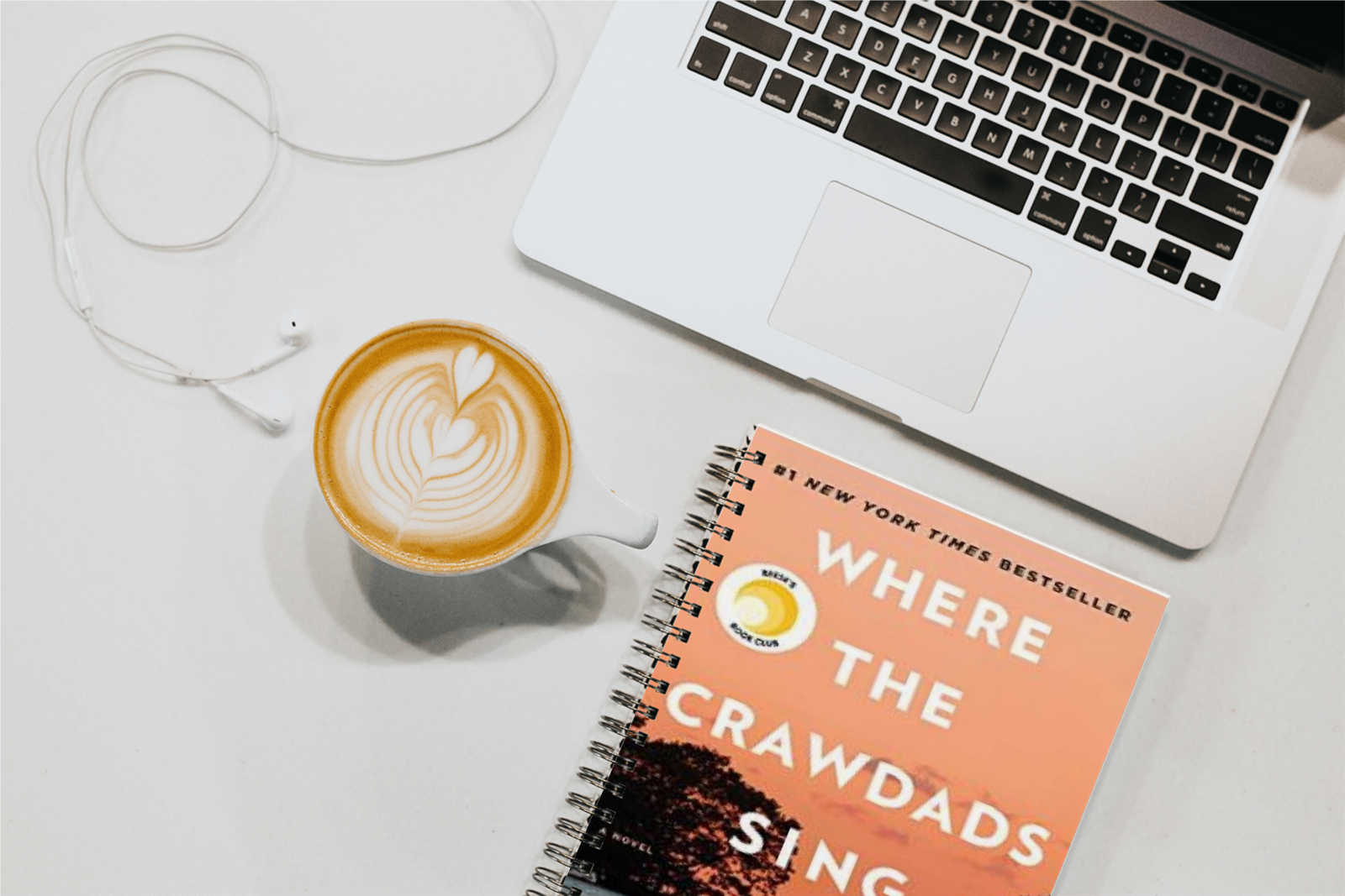 Spiral backed book with hot drink and laptop