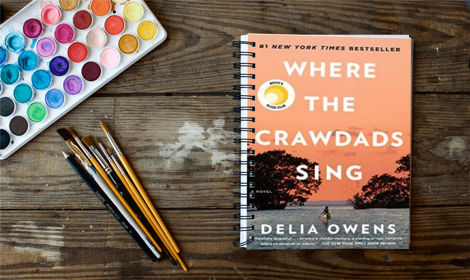 Mock 190 All Spiral Backed Mockup 190Mockup 190Spiral backed book on wooden decking next to paint brushes and paint palette