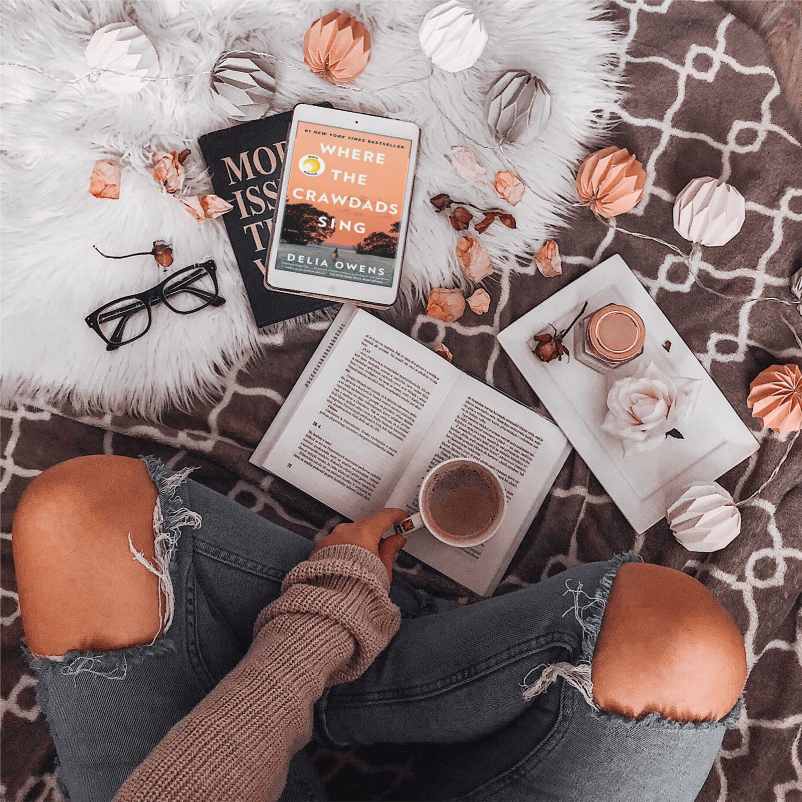 Mock 195 All Tablets Mockup 195Mockup 195Girl on bed with hot drink and E-book on white table. Reading glasses and white fur rug.
