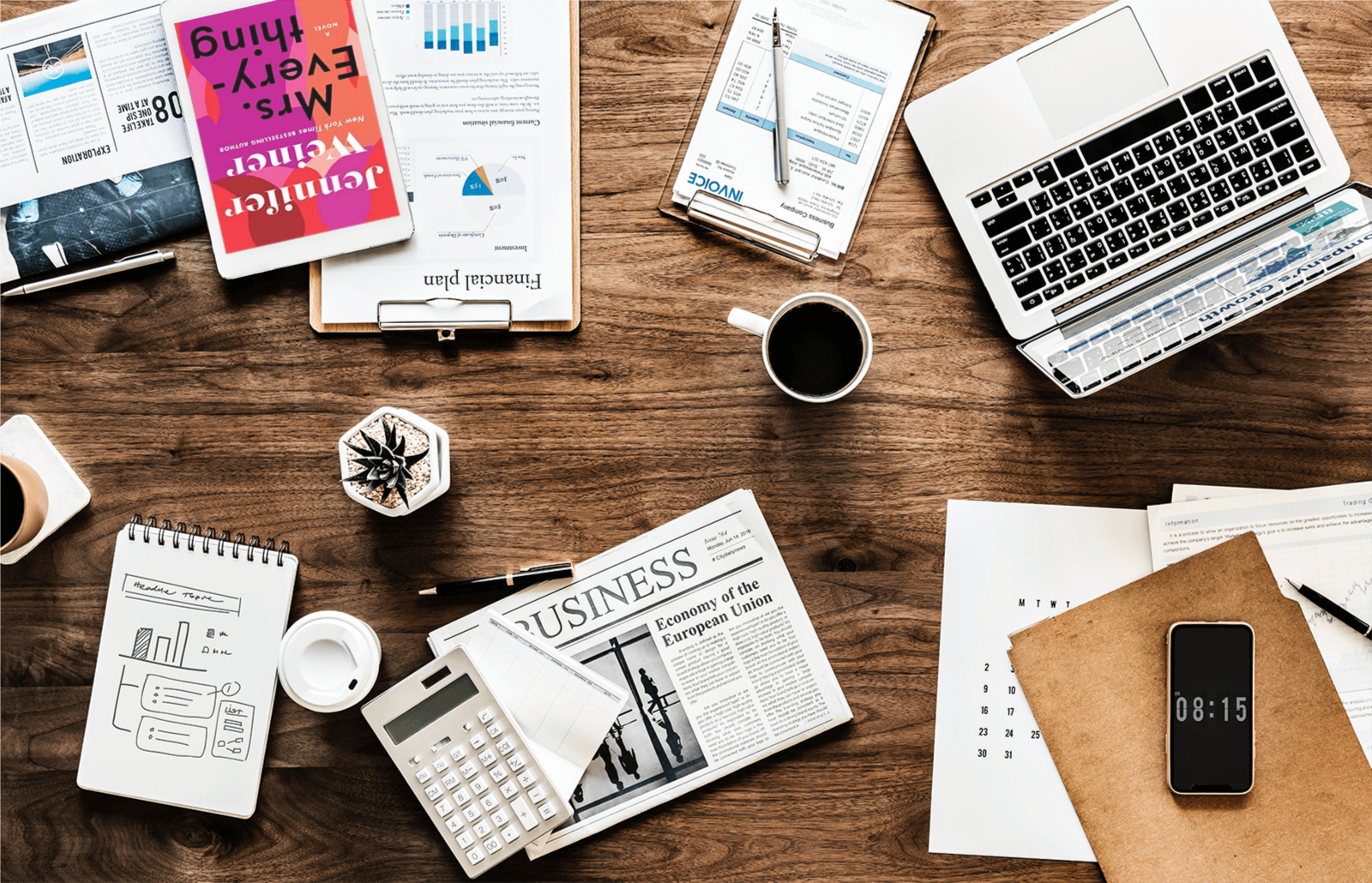Mock 220 All Tablets Mockup 220Mockup 220E-book on tablet on business desk with phone, newspaper, calculator, notepad, coffee, and paperwork.