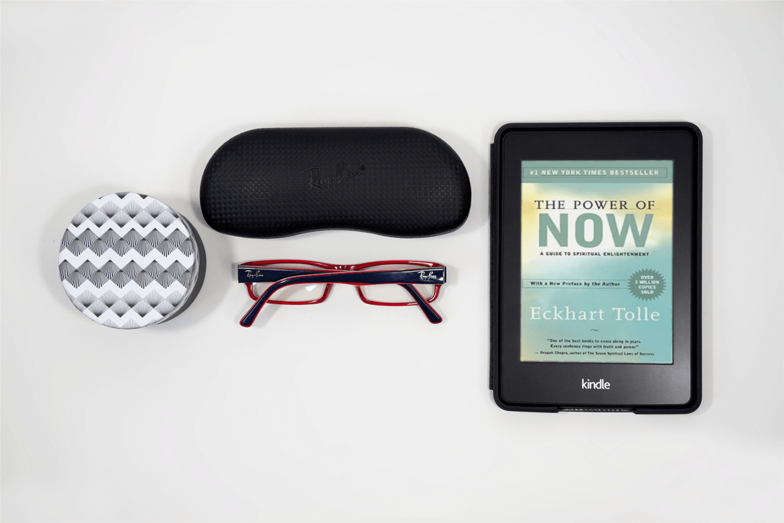 Mock 265 All Tablets Mockup 265Mockup 265E-book on black Kindle, reading glasses with case, black and white design case