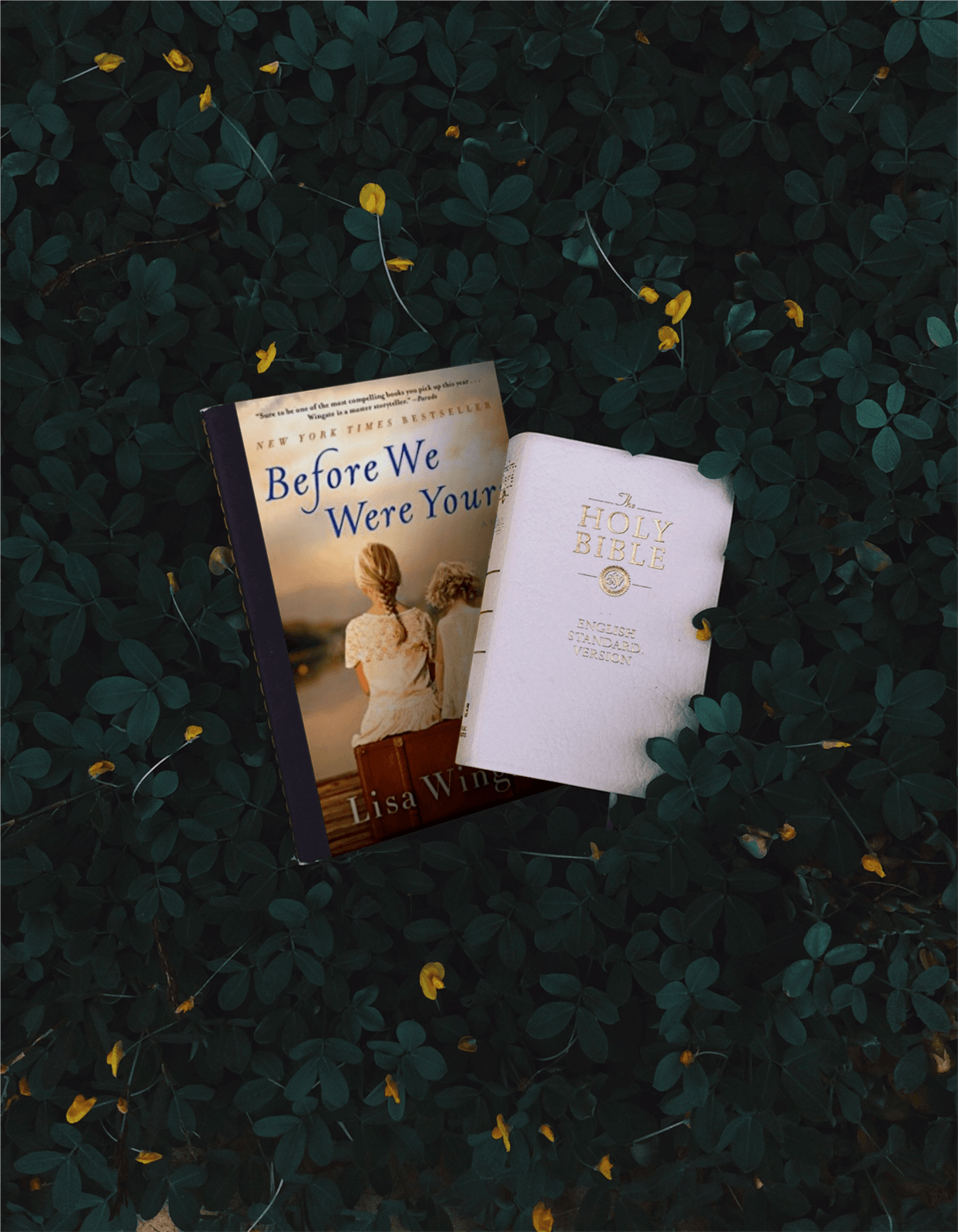 Dark plants with yellow flowers, black tablet with E-book or black binding on softback book with white Bible